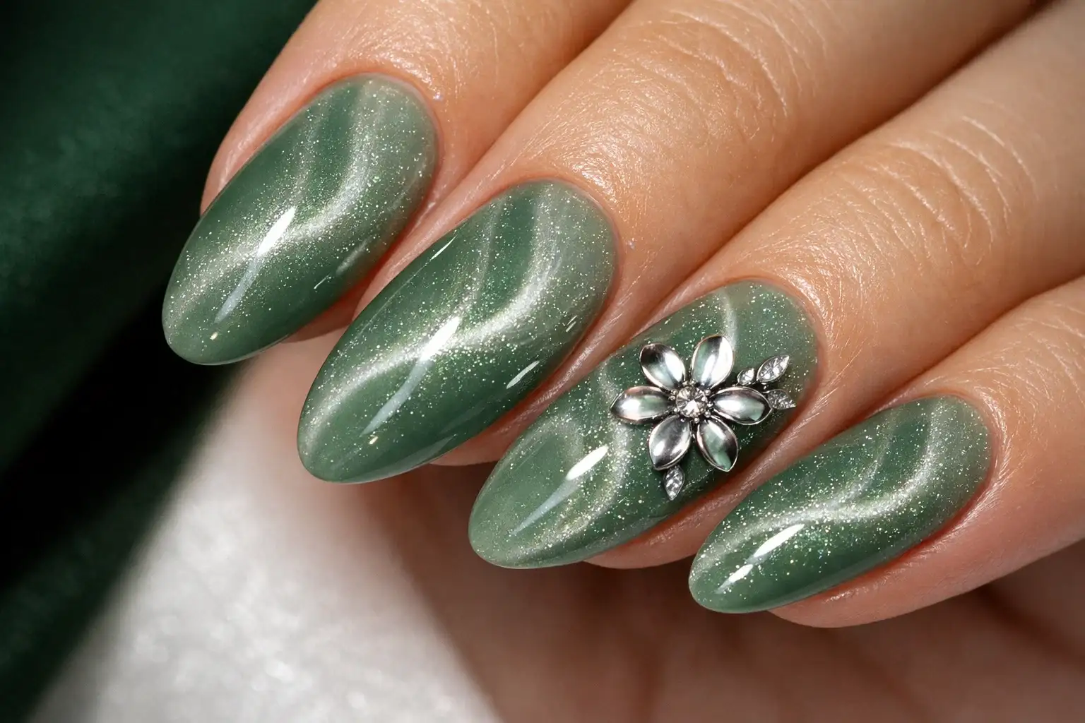 Cat-eye nails use magnetic polish to create a shimmering, shifting effect across the nail surface. The spring 2026 version combines this technique with a blooming gel finish that creates a soft, jelly-like overlay. Sage green cat-eye bases with chrome flower details are among the most requested variations this season.